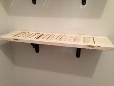 Here are some deco shelves for the master bath toilet room (I guess you could call it a water closet, but that sounds too British) made from old shutters and brackets from Hobby Lobby. Total project cost = $26. Thanks to my hubby for putting them up :)